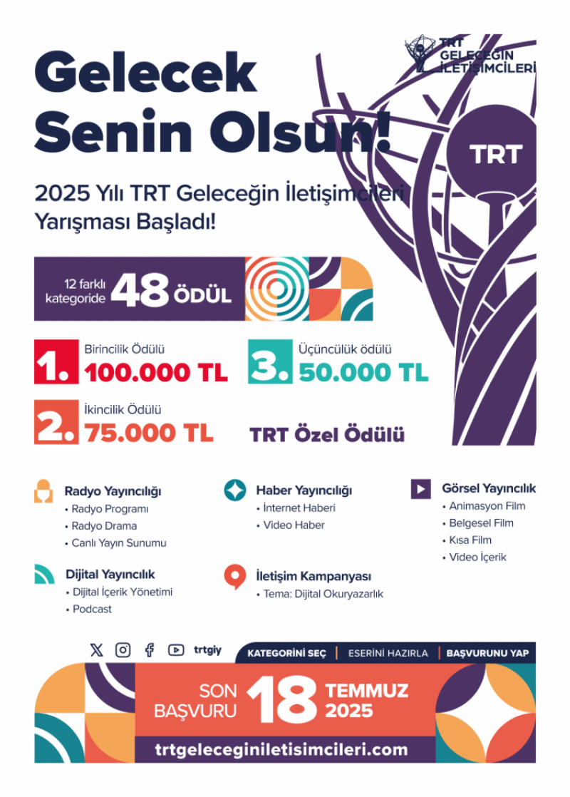 TRT tarafından gerçekleştirilen, Ön lisans, lisans ve yüksek lisans eğitimi devam eden öğrencilere yönelik; Görsel Yayıncılık, Radyo Yayıncılığı, Haber Yayıncılığı, Dijital Yayıncılık ve İletişim Kampanyası alanlarında 12 farklı kategoride nitelikli, yenilikçi ve ilham verici eserlerle katılabileceğiniz Geleceğin İletişimcileri Yarışması düzenlenmektedir. Yarışmaya başvurular 18 Temmuz 2025 tarihine kadar www.trtgeleceginiletisimcileri.com adresinden çevrim içi olarak gerçekleştirilebilecektir.