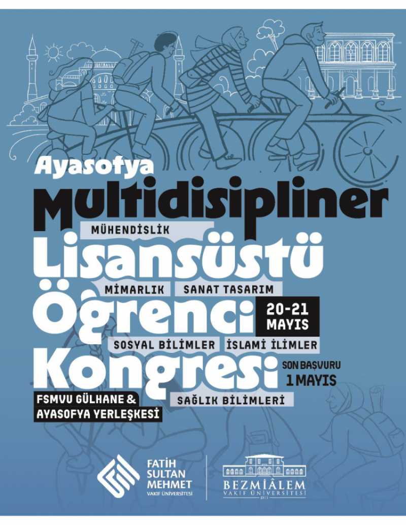Fatih Sultan Mehmet Vakıf Üniversitesi ve Bezmîalem Vakıf Üniversitesi tarafından 20-21 Mayıs 2025 tarihlerinde FSMVÜ Gülhane & Ayasofya Yerleşkesi'nde Multidisipliner Ayasofya Lisansüstü Öğrenci Kongresi gerçekleştirilecektir. Kongre Mühendislik, Mimarlık, Sanat Tasarım, Sosyal Bilimler, İslami İlimler ve Sağlık Bilimleri alanlarını kapsamaktadır. Başvurular için https://ogrencikongresi.fsm.edu.tr/ adresini ziyaret edebilirsiniz.